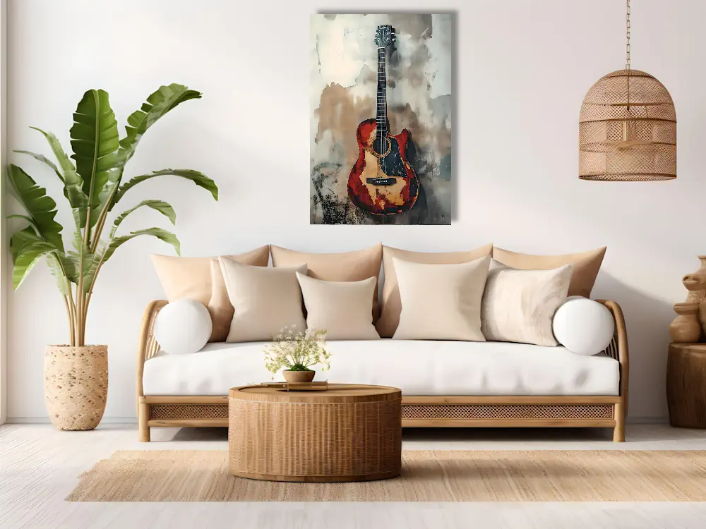 Abstract Guitar in Red Toning leaning against a Wall Printed Canvas Wall Art is for the homeowners who desire a bright coloured vibe to a softer room. This canvas artwork is expertly printed using high-quality, fade-resistant inks, ensuring the longevity and brilliance of the artwork. The large size and detailed craftsmanship make it a focal point for any space, whether it’s a living room or office.