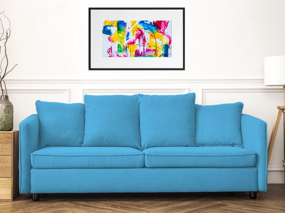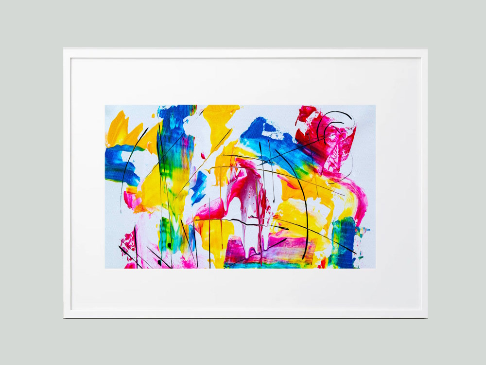 Pink, Blue, Yellow & Green Abstract Printed Artwork Wall Hanging in black or white timber frame. Perfect for a living room or master bedroom. This framed poster with a smooth, white mat board is printed on a quality matte paper and framed with a semi-hardwood alder frame.